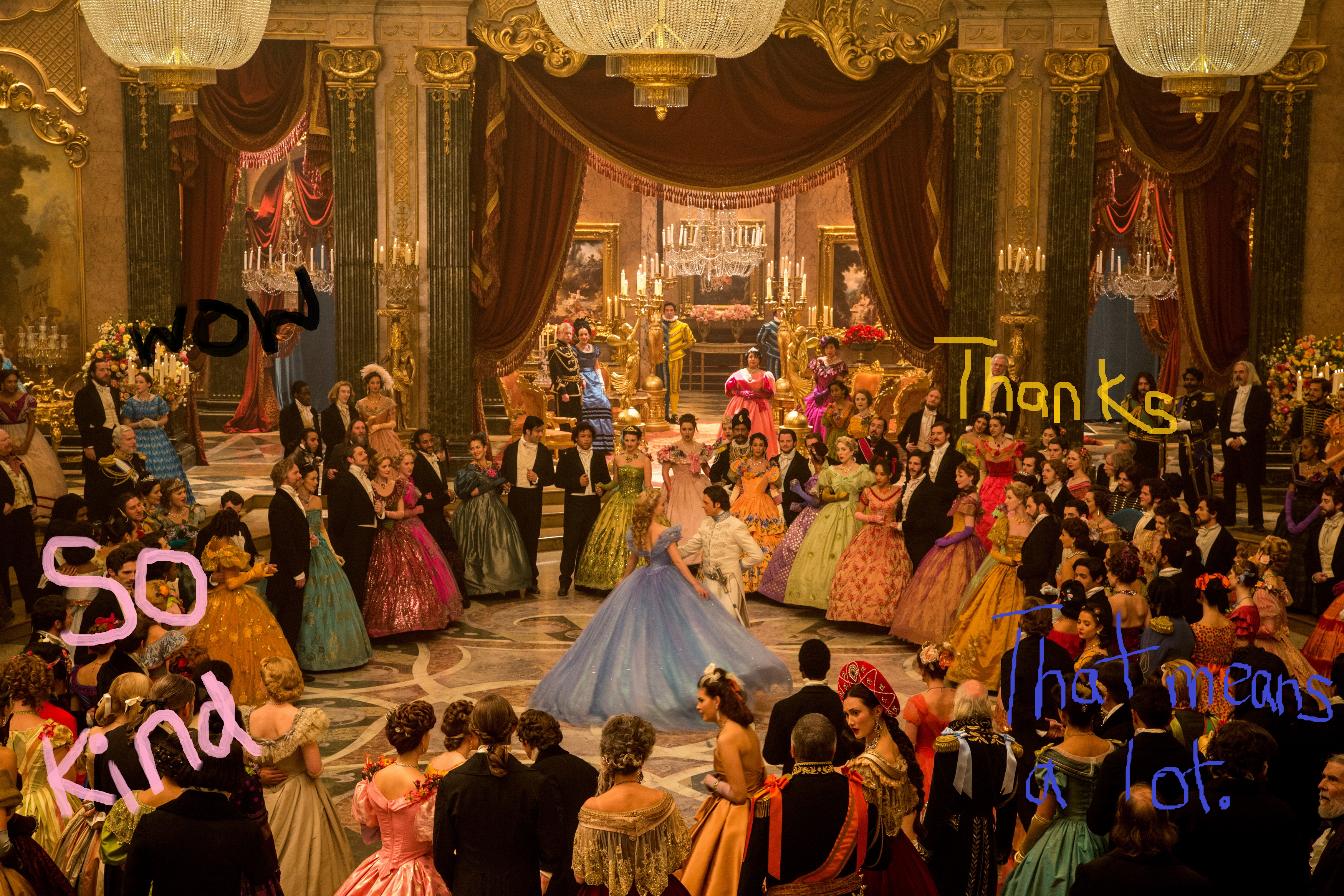 From the small details in Cinderella’s every day dress to the chandeliers in the palace, this film felt real. This, unfortunately, is where any semblance to reality ends. In fact, one of the opening lines of the film is Helena Bonham Carter’s Fairy Godmother character narrating that what made Ella (later Cinderella, because she slept by embers and got cinder marks on her face; they took the word “cinder” and added it to her name; cinder + Ella = Cinderella — do you get it?! It’s clever, dammit!) special was that, “she didn’t see how the world is, but rather how it could be.”